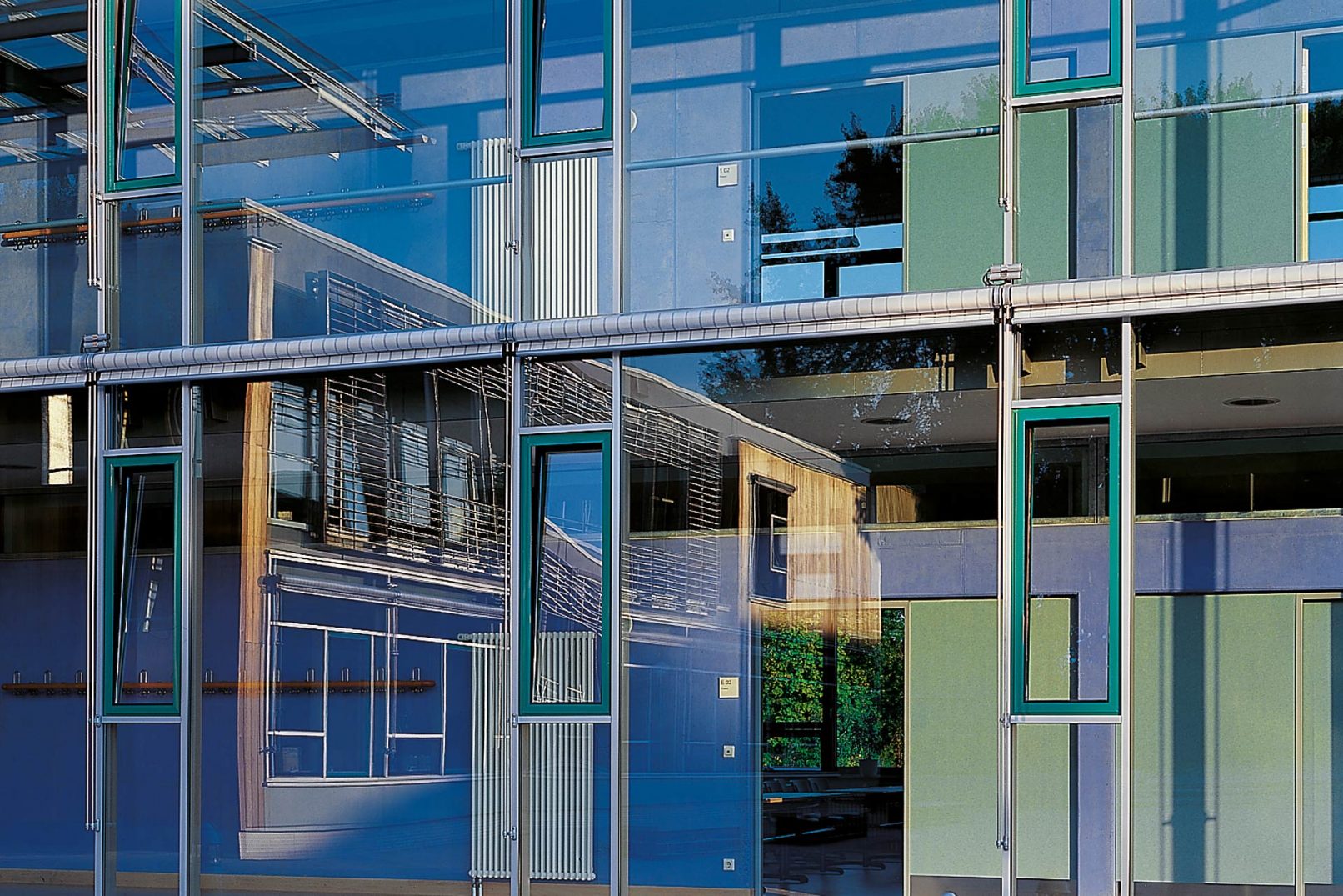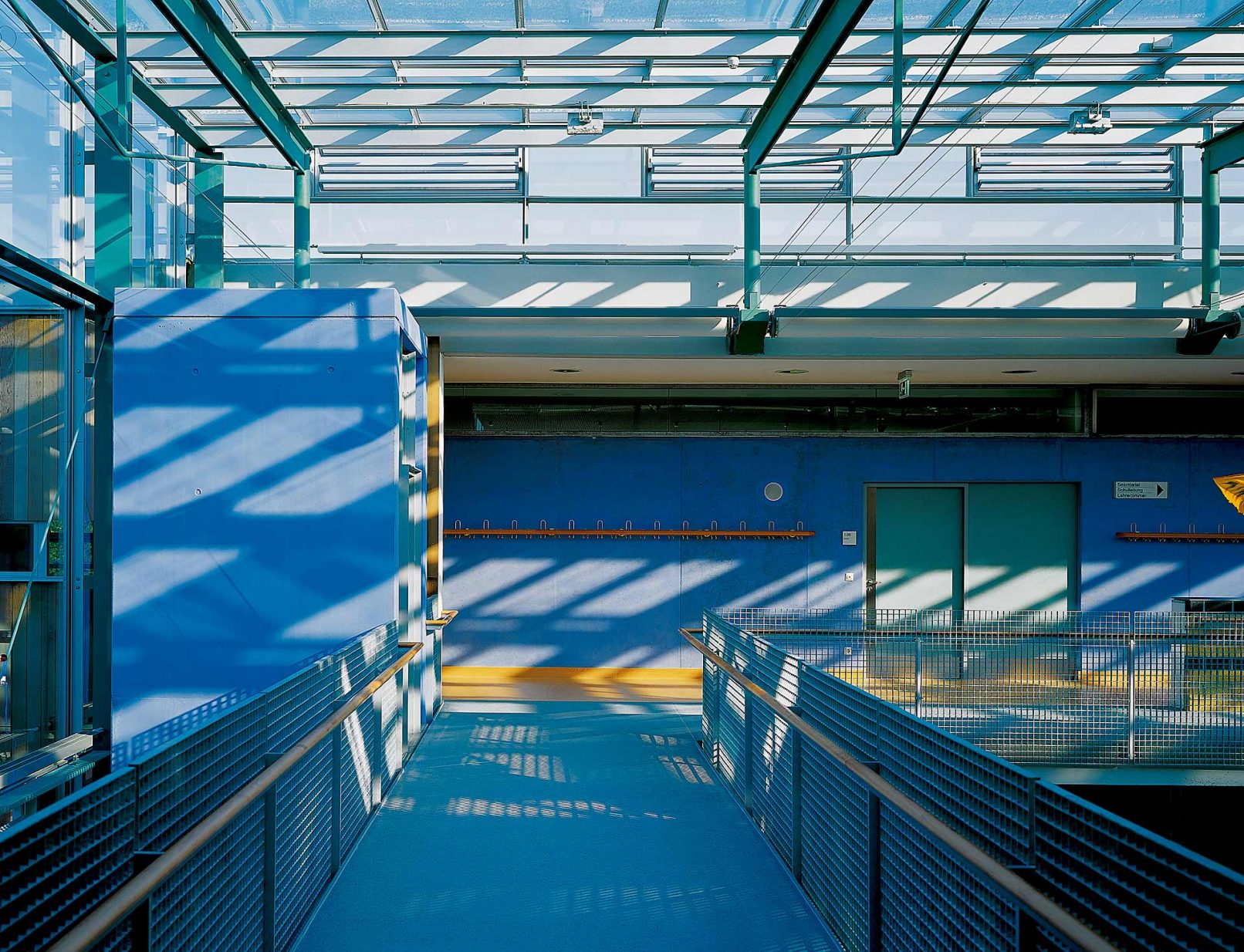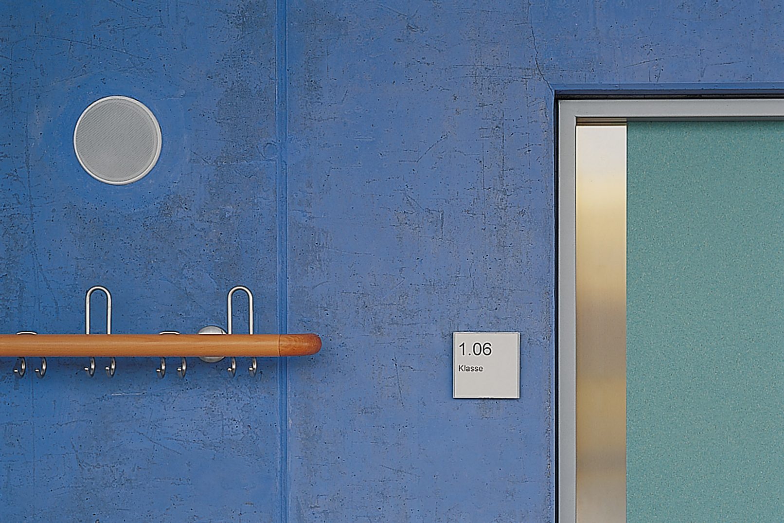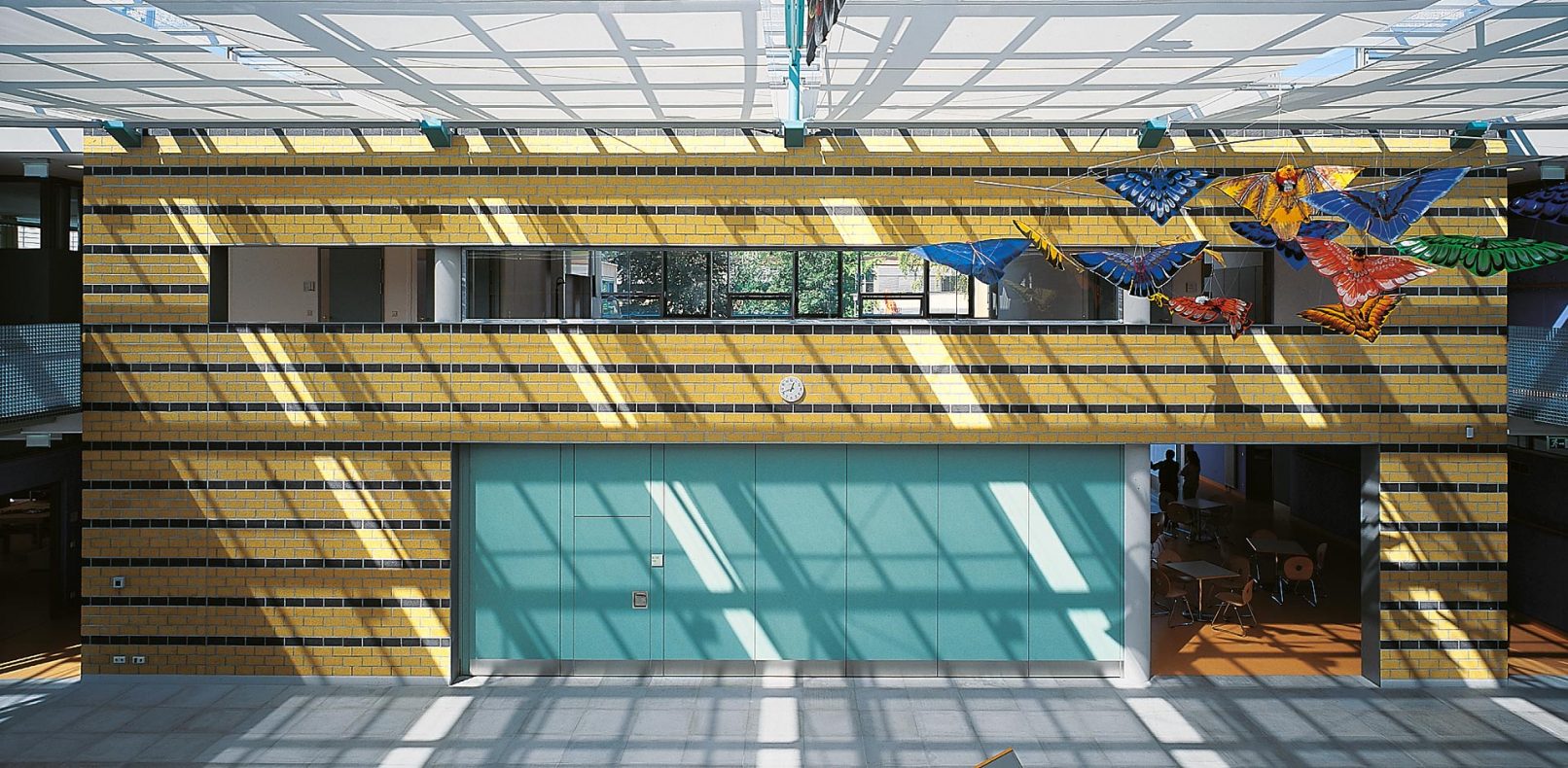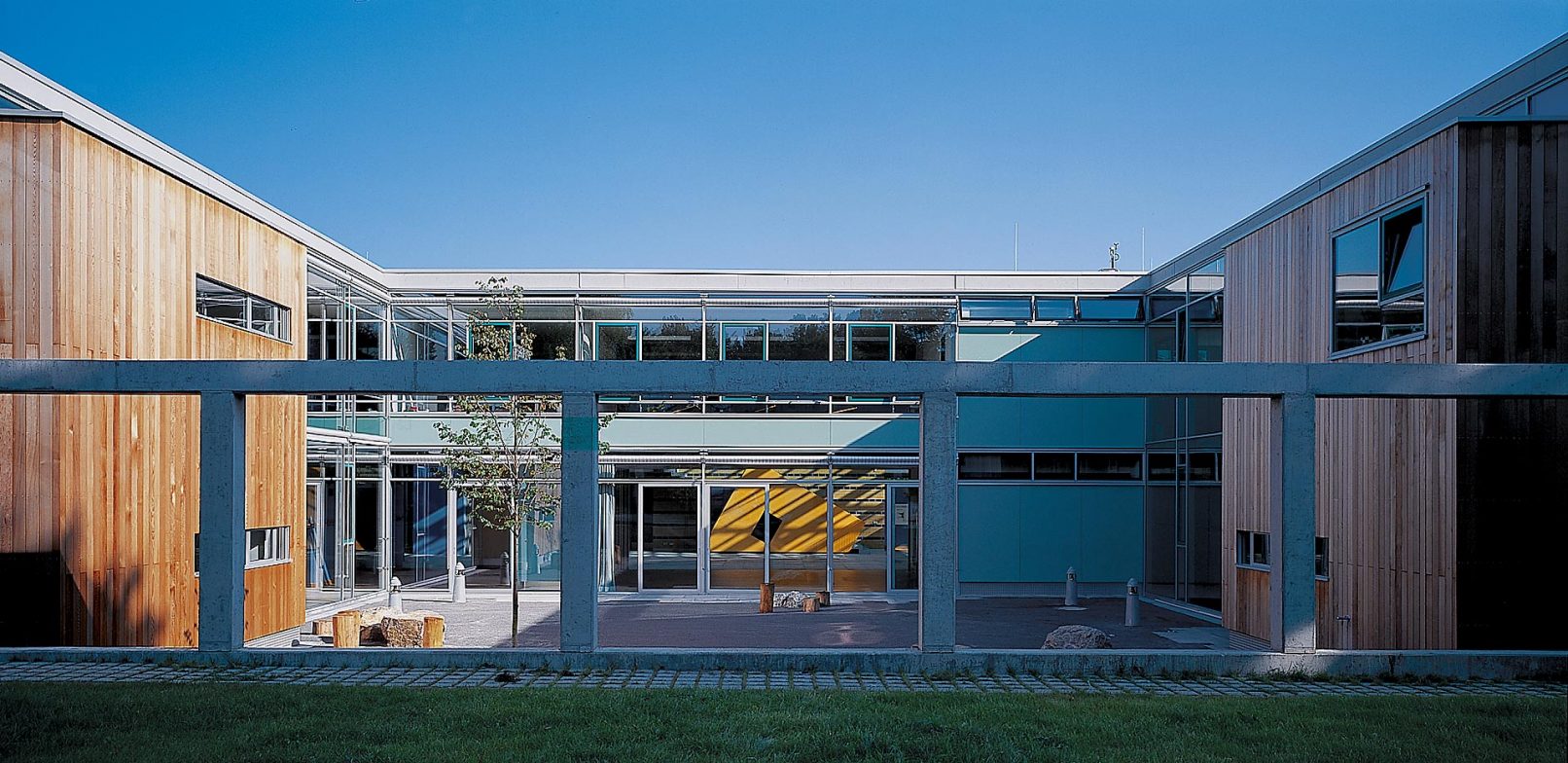 - Das Gebäude besticht durch seine klare Gliederung in einen langgestreckten Klassentrakt und einen u-förmigen, zweigeschossigen Funktionsbau, verbunden durch einen vollständig verglasten Erschließungs- und Mehrzweckbereich.