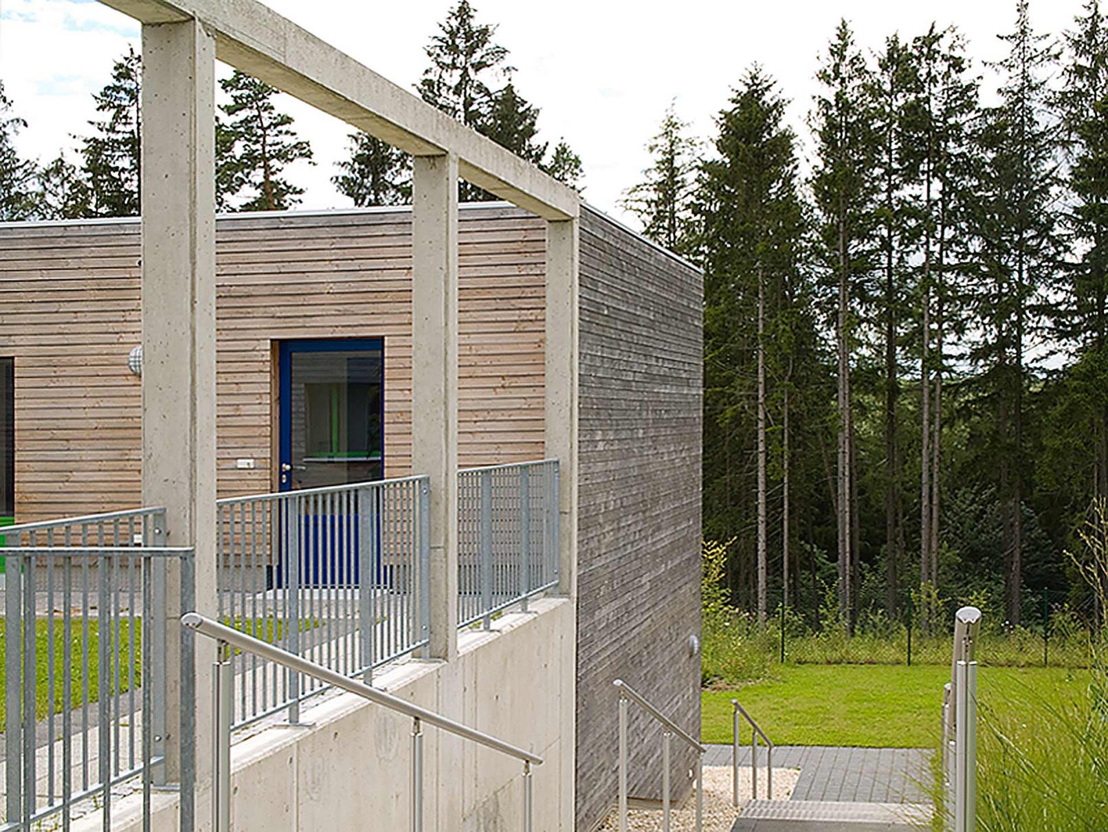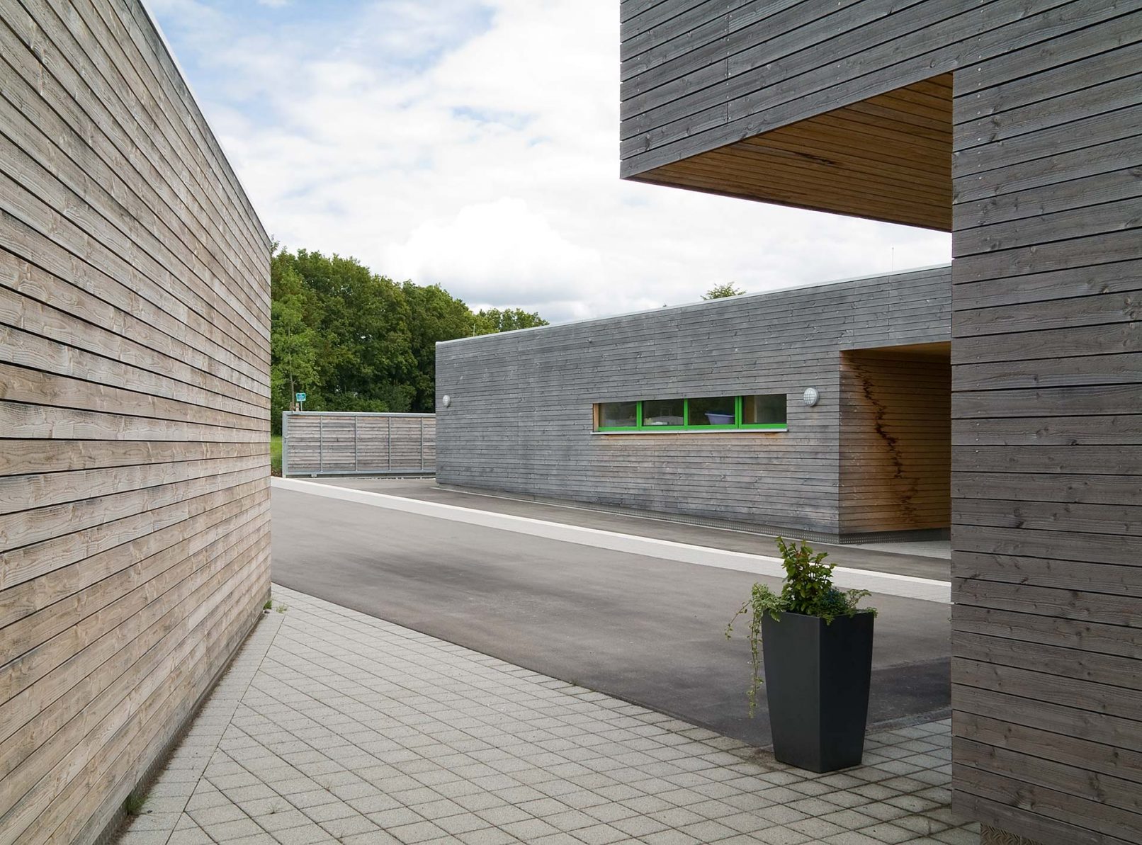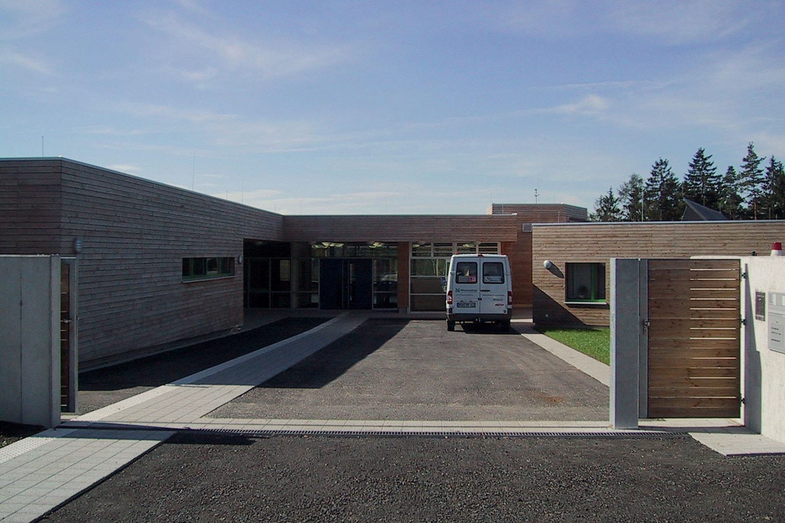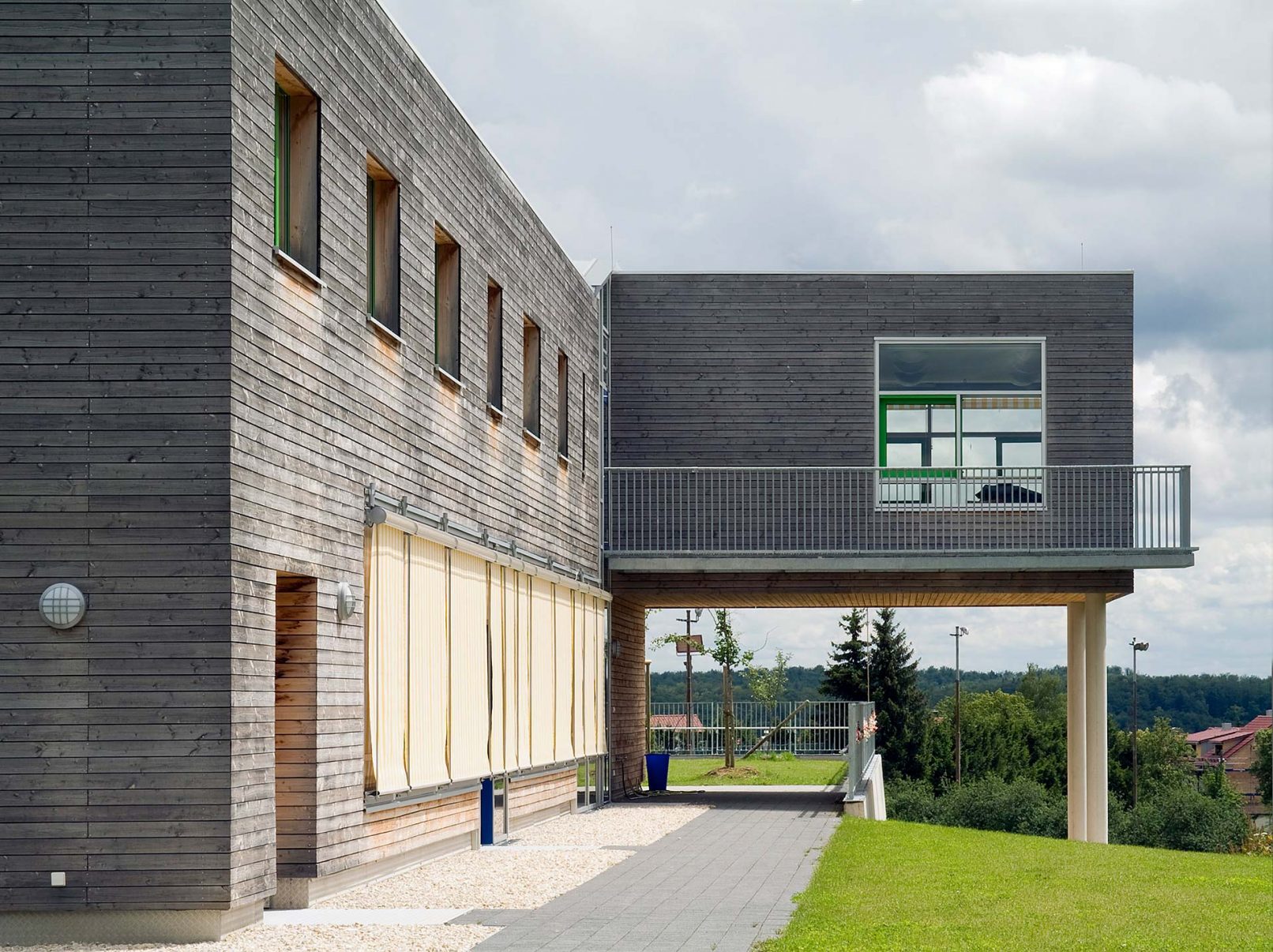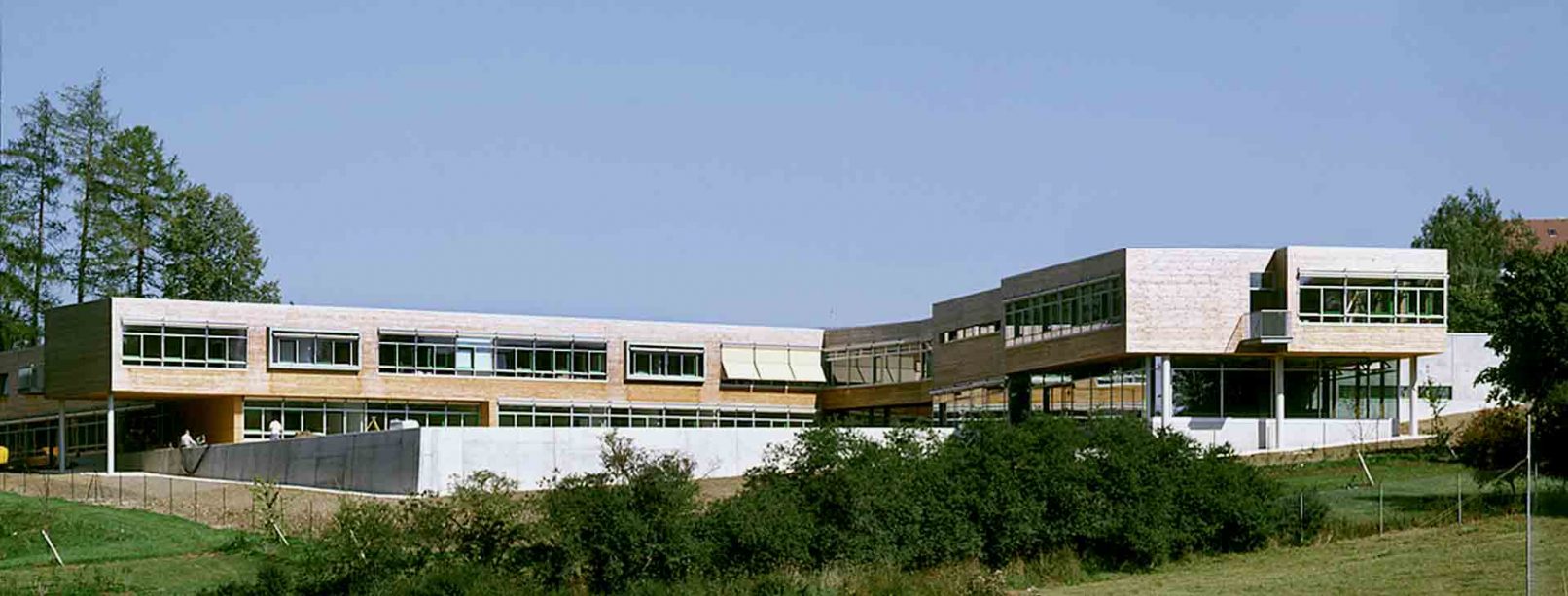 - „Das Erscheinungsbild wird durch kubische Baukörper, einheitliche Holzverschalung und klare Gliederung der Fensterbänder geprägt. Die großflächige Verglasung im Untergeschoß bei gleichzeitiger Auskragung der oberen Bauteile erzeugt eine gute horizontale Gliederung der Fassade.