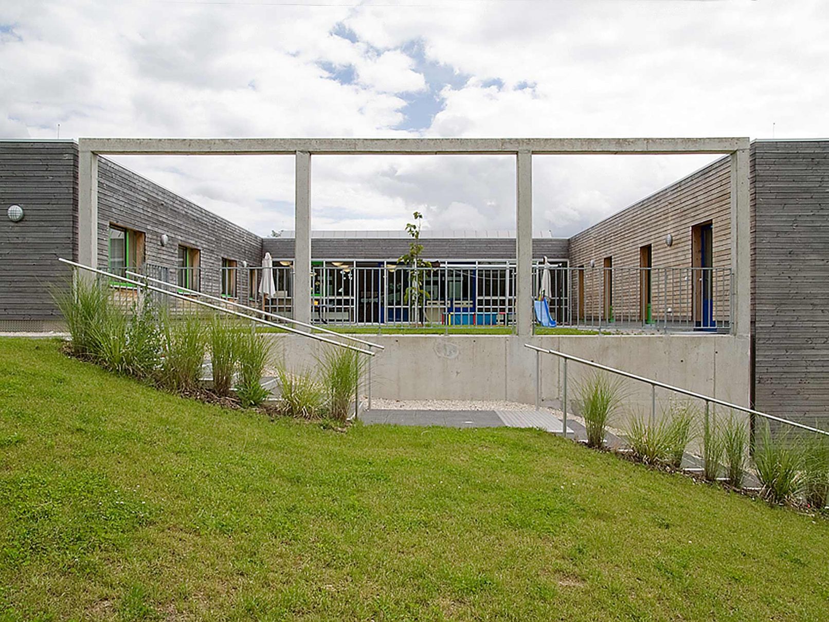 - Die Anordnung der Baukörper und die innere Struktur setzen die funktionalen Ansprüche der Heimsonderschule konsequent um. Dies wird durch Lichtführung, Materialwahl und Farbgebung unterstützt.