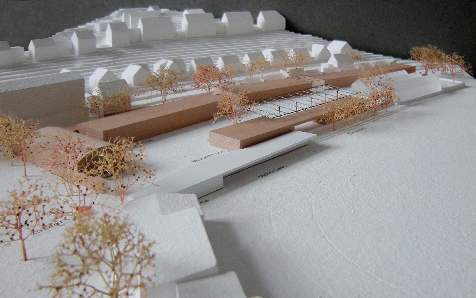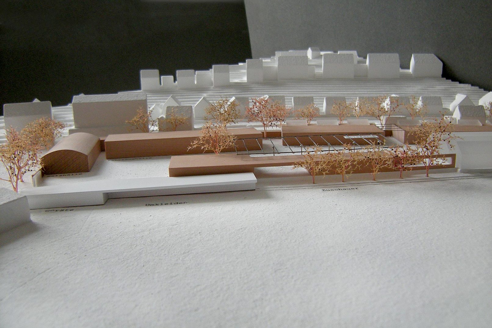 - Die städtebauliche Figur nimmt sehr überzeugend die vorhandenen Strukturen der Nachbarschaft auf: Die Hallen im Norden baukörperlich gegliedert und die Ausrichtungen der dortigen Wohngebäude aufgreifend, die Funktionsbereiche, die sich in Höhe und Abmessung differenzierter formulieren lassen, im Süden zum Sportplatz.