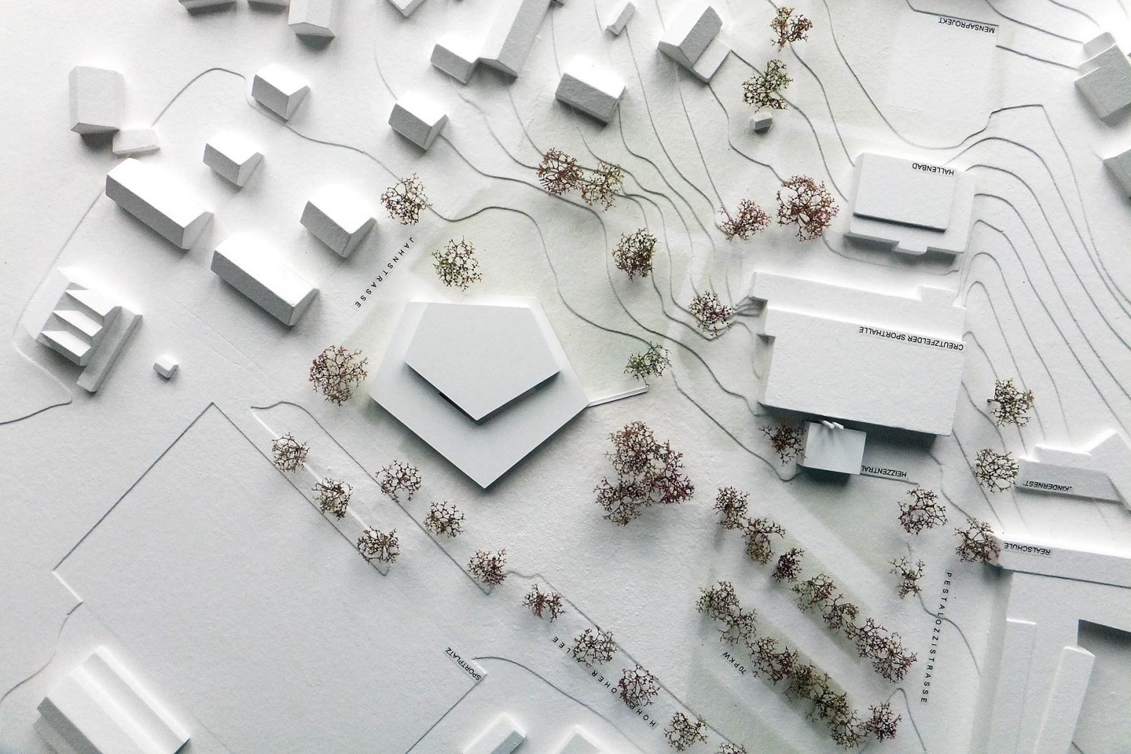 - Der polygonale Baukörper der Gemeindehalle in der Nord-Ost-Ecke platziert, entwickelt seine Präsenz als öffentliches Gebäude an der Hohenlohe-Allee und gleichzeitig erfährt der grüne Campus-Bereich einen wirksamen Abschluss. (….)