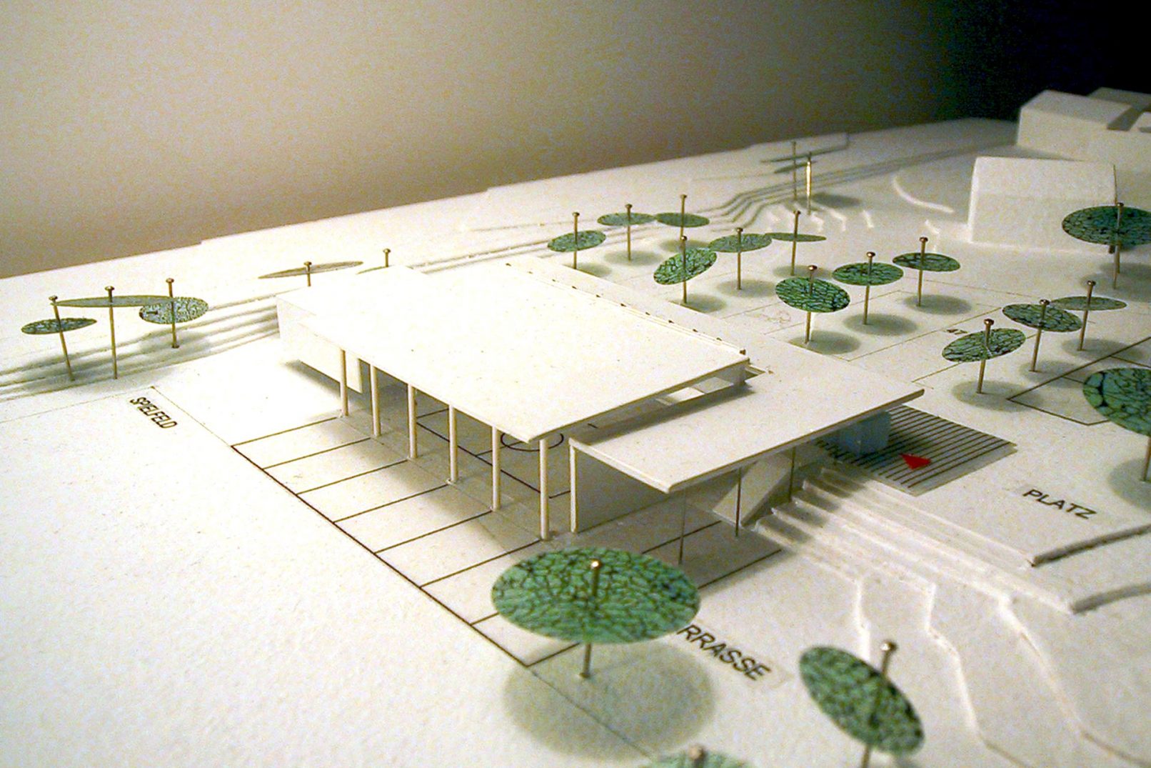 - Die neue Mehrzweckhalle am Ortsrand macht den Geländesprung zur Talaue spürbar und nutzt diese Situation zur Minimierung der Baumassen sowie zur direkten Anbindung der beiden Ebenen des Innenraums an den Außenbereich. Der festliche Eingangsbereich auf der oberen Ebene ist dem Ort zugewandt. Die zweigeschossige Spange mit den Nebenräumen legt sich wie ein Rücken Richtung Parkplatz in den Hang, die Orientierung der Halle geht nach Süden hin in die freie Landschaft. Eine kleine transparente Halle verbindet beide Ebenen, sowie Innen und Außen. Sie ist gleichzeitig Foyer, Galerie, Bar und Begrüßungsraum.