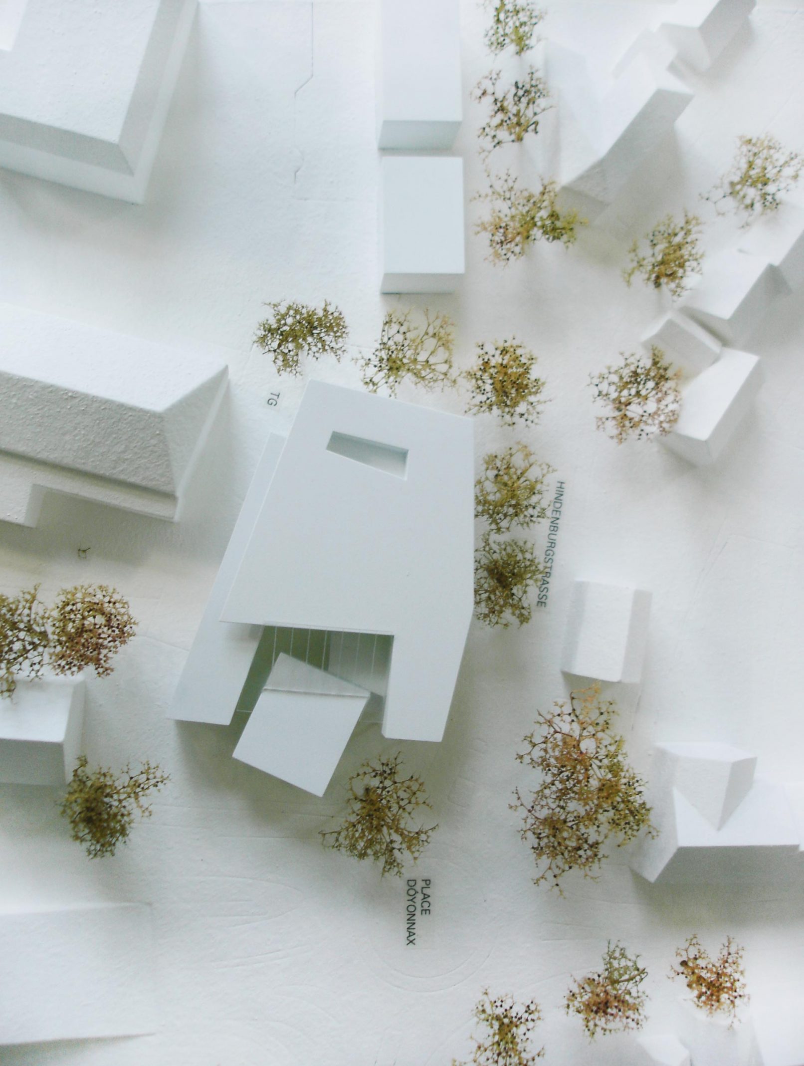 - Schloss, Kino, Apotheke und Rathaus werden als zusammenhängender Platzraum entwickelt. Besondere Bedeutung kommt hier dem kopfartigen Sitzungssaal-Bauteil des Rathauses zu. Es entsteht eine große zweigeschossige Loggia, die in ihrer Dramatik kontrovers diskutiert wird. Trotzdem ist diese Geste und die Stellung des Rathauses richtig, der Place d´Oyonnax wird als „Stadtraum“ gefasst.
