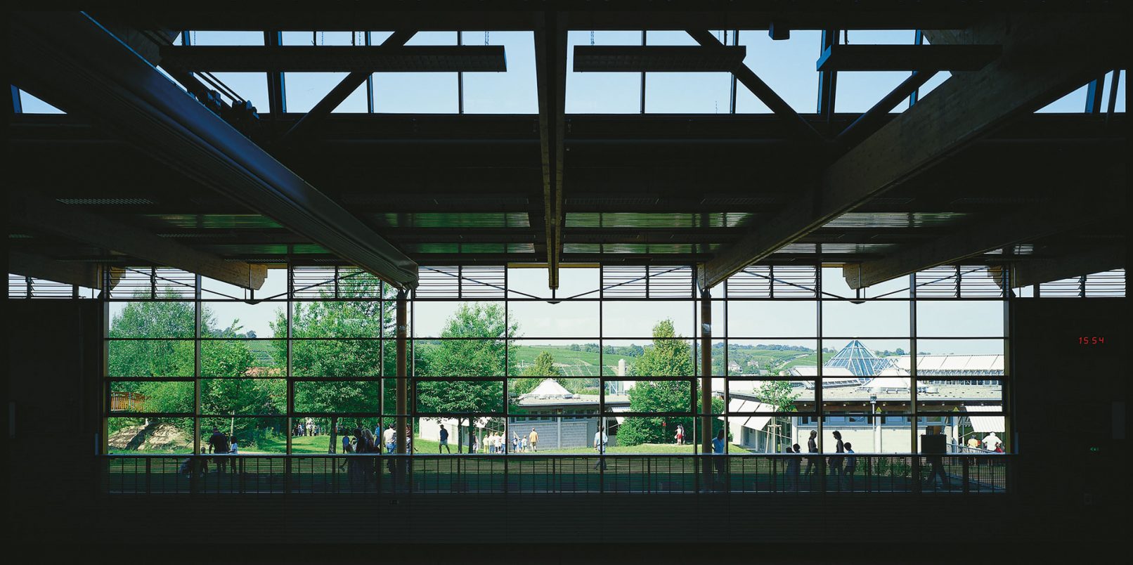 - (...) Besonders schön ist der Blick sowohl von der Erschließungsgalerie, wie von der Halle selbst zum Grün und zur Landschaft.